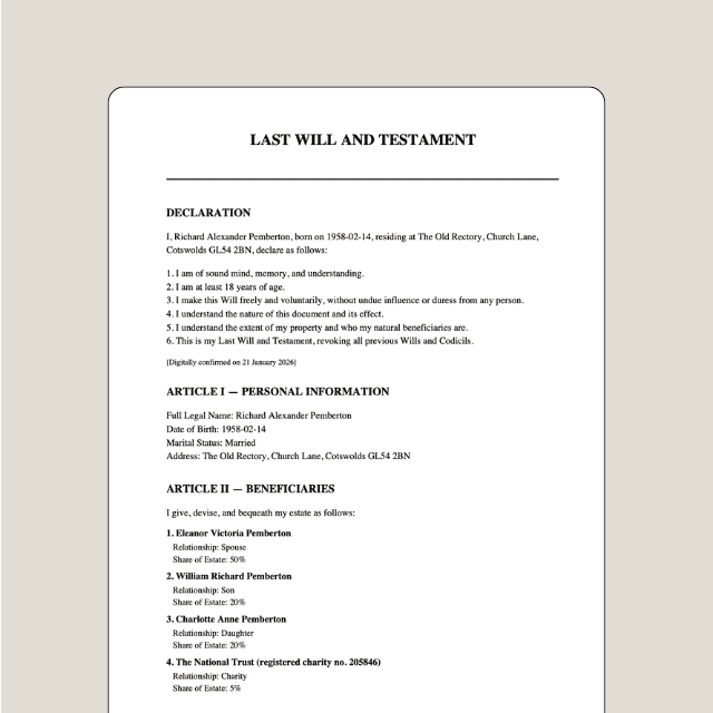 This information is provided for general guidance only and does not constitute legal, tax, financial, or other professional advice. You should not rely on this content when making any decisions, as it cannot replace advice tailored to your specific circumstances. Always consult a qualified, independent professional before taking action. writeawill.ai is not regulated by the Solicitors Regulation Authority and operates as an online document preparation service, not a law firm. We accept no responsibility or liability for any actions taken, or not taken, based on the information provided here.